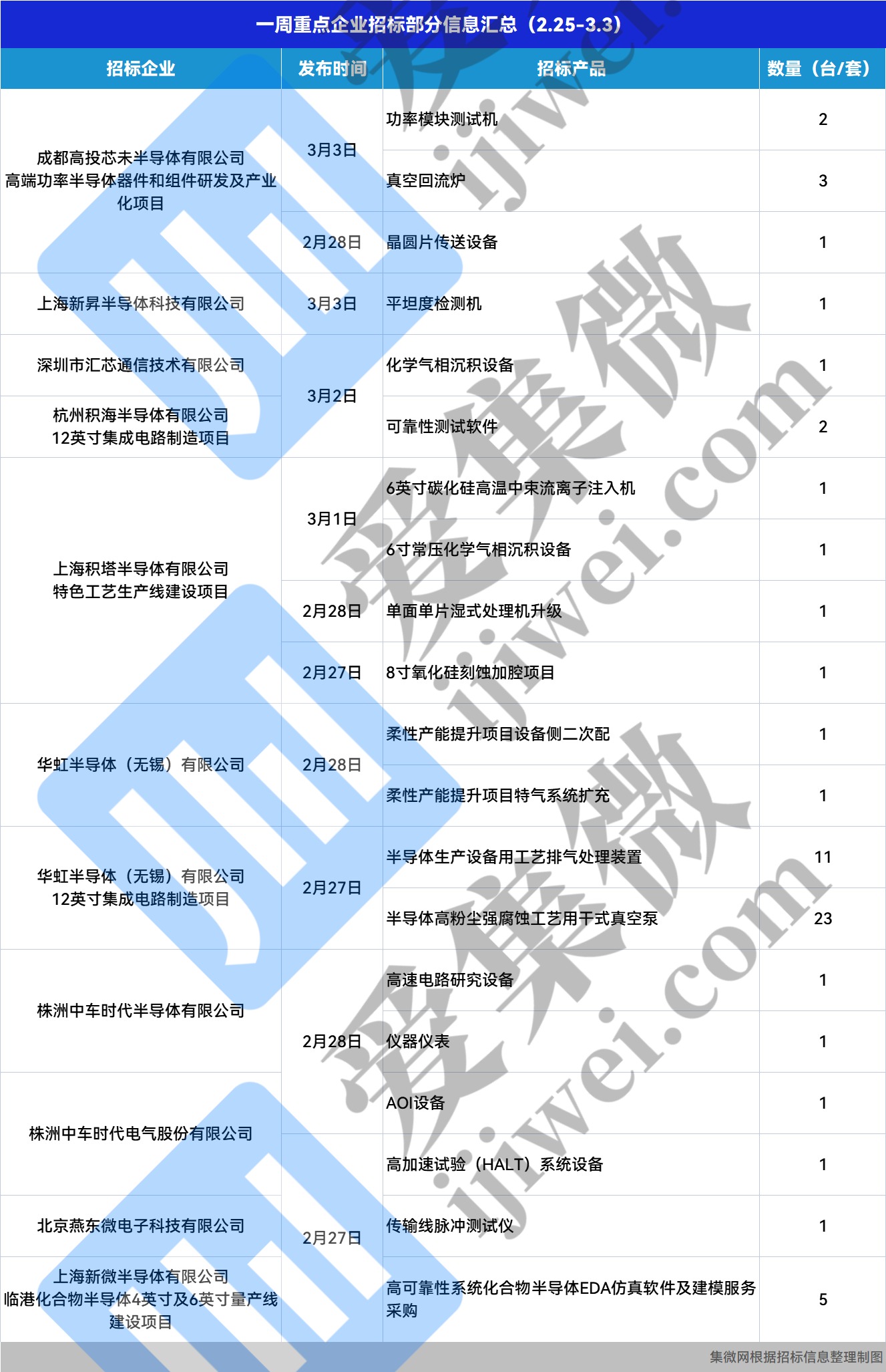 本周,上海积塔新增设备招标4台★◆■◆★★,燕东微新增设备招标1台■◆◆★,新昇半导体新增设备招标1台★■★★,汇芯通信新增设备招标1台;嘉芯迦能新增中标设备3台◆★◆,拓荆科技新增中标设备1台,富岚半导体新增中标设备1台◆■,应用材料新增中标设备2台,Disco新增中标设备5台◆◆■■★,KLA新增中标设备1台。